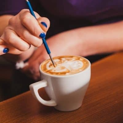 Most of the hand-designed latte art you’re used to seeing (think hearts and rosettas) is poured, not drawn. Fancier designs require latte art ‘pens’ which usually come in sets of three double-sided tools. These include a lance and spoon, a spatula and spike, and a hook and knob. The tools allow you to delicately draw with the crema and milk to create detail. Stainless steel wrapped in silicone is best for durability and grip.