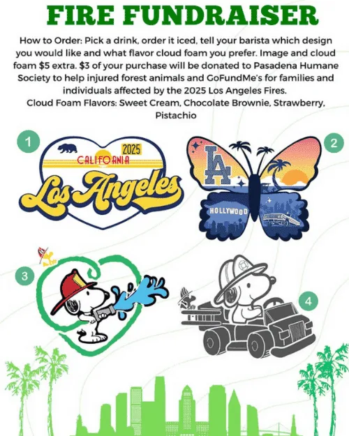 @honeygreenscafe_ Come purchase any drink with one of these four designs to donate to @Pasadena Humane and families that have lost everything in the Los Angeles fires ❤️‍🩹 #honeygreenscafe #lafires #donate #losangeles #altadena #palisade #pacificpalisades #pasadenahumanesociety #viralcafe #snoopy #snoopycoffee ♬ Evan Jacobson Sparks OUT NOW – Evan Jacobson