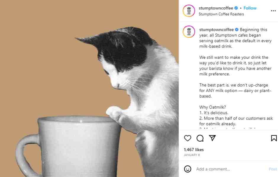2. Eco-friendly packaging Ditching single use plastic would make a big, visible impact that your customers will notice and support. According to Firstinsight (2020), most Gen Z shoppers prefer to buy sustainable brands and are willing to spend an average of 10% more on those products. 3. Offer plant-based milks Animal agriculture is a major contributor to greenhouse gas emissions and uses a significant amount of land and water. By offering plant-based milk alternatives like almond, soy, or oat milk, coffee shops can reduce their impact on the environment and offer more options for customers with dietary restrictions.Stumptown Coffee Roasters has even announced it will serve oat milk as the default for every milk-paired beverage across the entire chain.