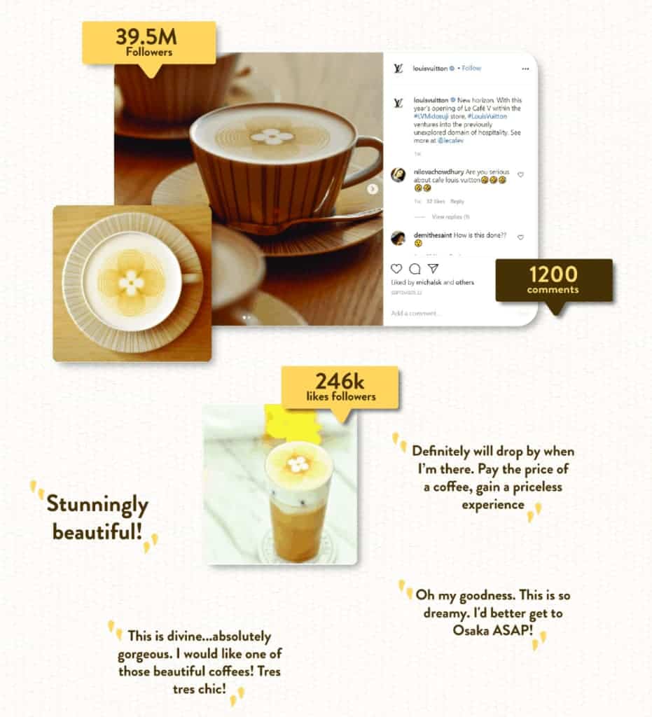 Customers eager to visit the café were looking forward to being surrounded by the famous Louis Vuitton monogram. An image shared by the brand on social media surprised and delighted followers, proving the power of bev-top media. louis Vuitton customers learned that each latte served is topped with a monogram-inspired print, created with the Ripple Maker.